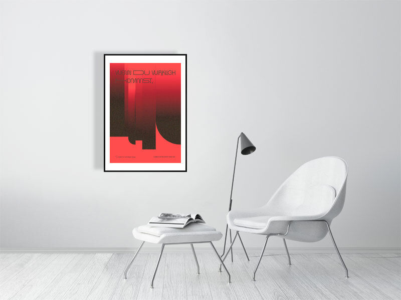 Ein Satz wie ein heimliches Flüstern – zwischen Sehnsucht, Dringlichkeit und einer leisen Endzeitstimmung. Dieses Plakat wirkt wie ein Moment kurz vor einer Entscheidung: rot glühend, körnig, minimalistisch, mit Schattenformen, die an Türen, Ausgänge oder unbekannte Räume erinnern. Der schimmernde Rot-Verlauf, die weiche Körnung und die futuristische Typografie schaffen ein Gefühl von Aufbruch und Unsicherheit – ein ästhetischer Abschied, oder ein Anfang, der sich noch nicht entschieden hat. Ein Kunstwerk für alle, die emotionale Ambivalenz und atmosphärische Intensität lieben