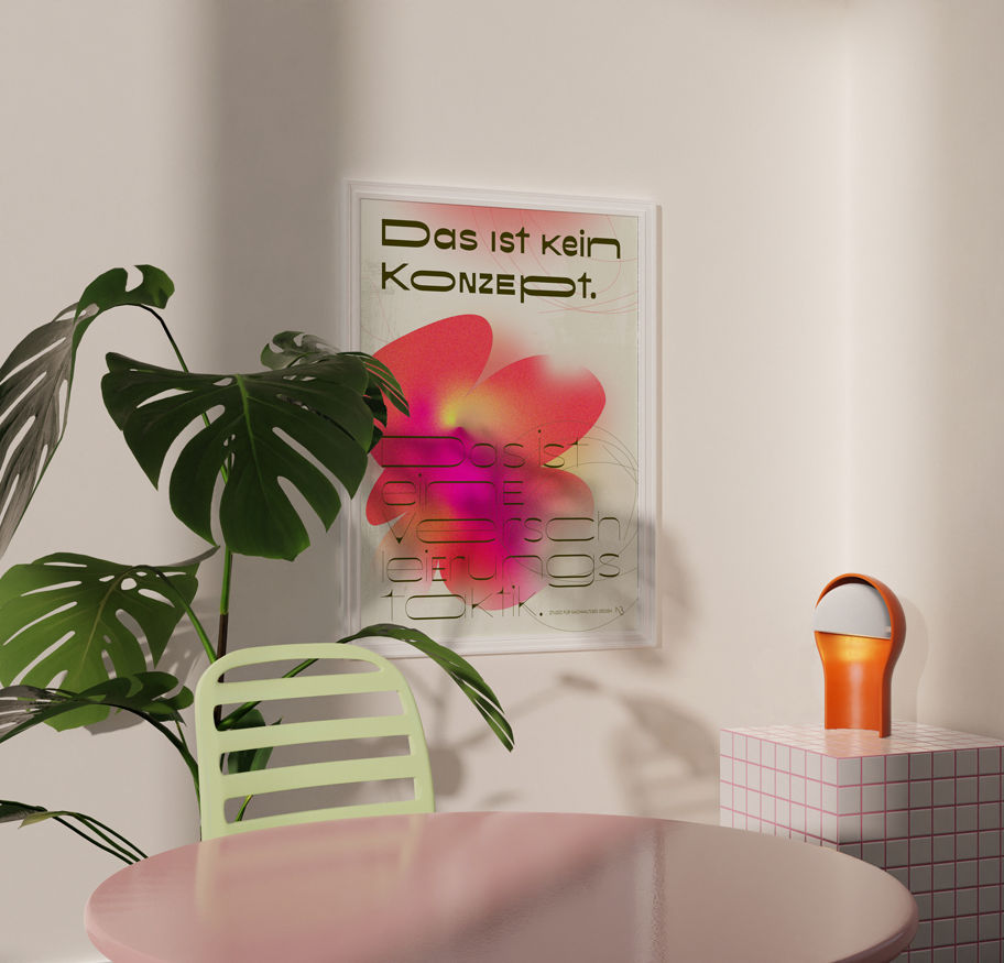 Ein Plakat, das so tut, als wüsste es etwas, das du nicht wissen sollst. Ein Design, das Konzeptlosigkeit zum Konzept erhebt – und damit die Kreativwelt charmant herausfordert: Was ist echt? Was ist nur Fassade? Und ist Fassade nicht manchmal das Schönste? Die leuchtend pinken, organischen Formen wirken wie visuelle Störsignale, umgeben von feinen, gestischen Linien und einer futuristischen Typografie, die sich fast tarnt. Ein ästhetisches Doppelspiel zwischen Enthüllung und Verbergen. Perfekt für Studios, Ateliers und Räume, die Humor, Meta-Ebene und starke Farbe vertragen